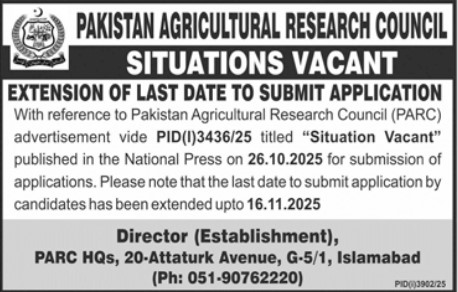 - With reference to Pakistan Agricultural Research Council (PARC) advertisement vide PID (1)3436/25 titled “Situation Vacant” published in the National Press on 26.10.2025 for submission of applications.