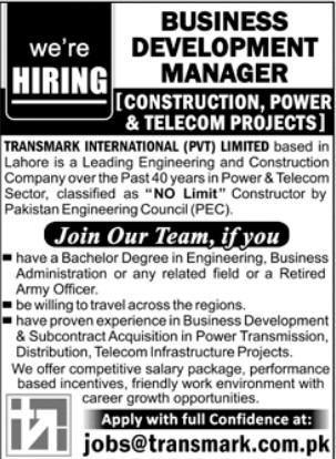 Both Male and Female candidates can apply for these Transmark International Jobs who have the Qualification: have a Bachelor’s Degree in Engineering, Business Administration, or any related field, or are a Retired Army Officer. be willing to travel across the regions. have proven experience in Business Development & Subcontract Acquisition in Power Transmission, Distribution, Telecom Infrastructure Projects. We offer a competitive salary package, performance-based incentives, a friendly work environment with career growth opportunities, and much more. Experienced candidates should apply within 7 days.