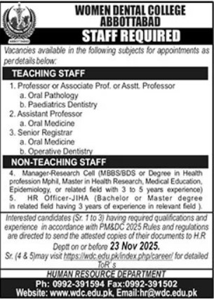 Both Male and Female candidates can apply for these Dental College Jobs 2025 who have the Qualification: Manager-Research Cell (MBBS/BDS or a Degree in a Health profession, MPhil, Master’s in Health Research, Medical Education, Epidemiology, or related field with 3 to 5 years of experience) 5. HR Officer-JIHA (Bachelor’s or Master’s degree in a related field, having 3 years of experience in the relevant field), and many more experienced candidates should apply before 23 November 2025.